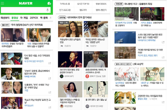 네이버는 5월 7일 보다 다양한 제휴 채널과 영상을 소개하기 위해 모바일홈 동영상 판에 네이버와 제휴한 단독 콘텐츠를 소개하는 '네이버 오리지널'과 다큐멘터리 등 이색 소재의 영상을 소개하는 고정 영역을 신설한 바 있다. 이후 웹애니메이션, 웹드라마, 72초 TV, 다큐멘터리 등 실험적이고 다양한 영상들과 요일별로 과학/심리/역사/여행 등 비예능 분야의 콘텐츠를 메인에서 소개했다.