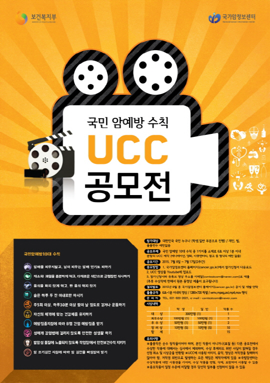 응모방법은 UCC영상을 유투브(Youtube)에 업로드한 후, 국가암정보센터 홈페이지(www.cancer.go.kr)에서 참가신청서를 다운로드하여 작성한 참가신청서와 유투브 영상 링크 주소를 이메일(contestcom@naver.com)로 제출하면 된다. 접수된 공모작은 심사를 통해 대상 1편 300만원, 최우수상 2편에 각 100만원 등 총 15작품에 700만원의 상금을 수여한다. 수상작은 국가암정보센터 홈페이지와 SNS 등을 통해 공개되고, 앞으로 암예방 홍보자료로 활용될 예정이다.