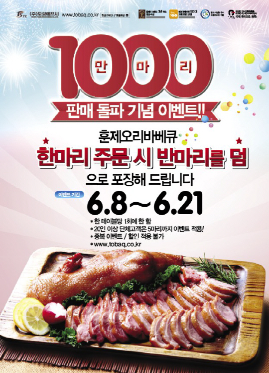 옛골토성이 4일 오리 1000만 수 판매를 기념해 이색 이벤트를 진행한다고 밝혔다. 오리 한 마리를 주문하면 반 마리를 덤으로 포장해주는 것. 이벤트 기간은 6월 8일부터 21일까지 2주간이다. 옛골토성은 권태균 대표가 개발한 바비큐 가마를 통해 요리를 하는 게 특징이다. 500도 이상의 고온에 참나무 장작으로 1시간여 이상 훈제돼 기름기는 쏙 빠지고 특유의 향이 배어 있는 맛을 자랑한다. 최근에는 삼겹살, 목살, 갈비살로 구성된 한돈 돼지한마리바비뷰를 출시해 젊은 고객들로부터 좋은 반응을 얻고 있다.