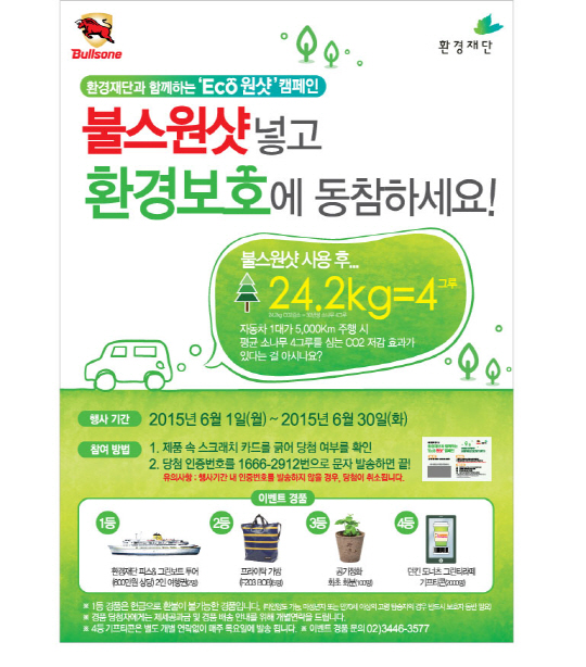 자동차용품 기업 불스원은 6월 환경의 달을 맞아 환경재단과 함께 오는 30일까지 전국 대형 할인점에서 'ECO원샷' 캠페인을 진행한다.