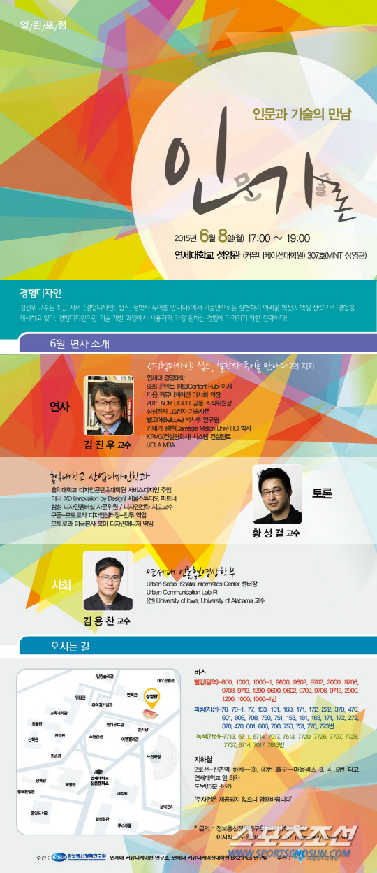 행사 당일 연세대 성암관으로 오면 누구나 참여할 수 있다. 행사 후 동영상을 정보통신정책연구원의 온라인 채널로 공유할 예정이라 언제든 찾아볼 수 있다. 'ICT인문사회연구포럼'의 페이스북 (www.facebook.com/groups/ICTHUMAN/)에서도 볼 수 있다. 남정석 기자 bluesky@sportschosun.com