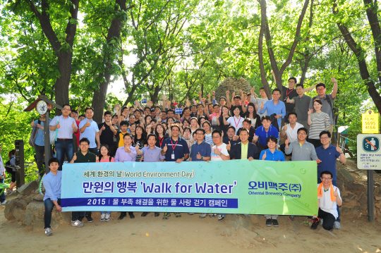 오비맥주가 세계 환경의 날을 맞아 5일 서초구 우면산에서 글로벌 본사인 AB인베브와 함께 '물 사랑 걷기(Walk for Water)'캠페인을 벌였다.