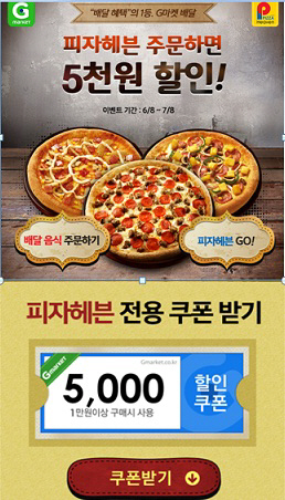 피자헤븐(대표 최광준)이 8일 배달앱인 'G마켓배달'과 Co-Marketing으로 6월 한달간 피자헤븐 전용 5000원 할인쿠폰을 증정하는 이벤트를 진행한다고 밝혔다. G마켓 배달앱은 기존 업체들 보다 뒤늦게 시장에 진입을 했지만 자본력, 마케팅 그리고 업계 최고의 고객 데이터를 기반으로 배달앱 시장에서 큰 이슈를 불러일으키고 있다.
