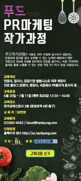 대상자는 언론사, 잡지사, 공공기관 칼럼니스트 직무 희망자, 전문 블로그 운영자, 영양사, 식품회사 PR홍보직 종사자 등으로 음식에 관심 있는 사람이라면 누구나 참여 가능하다.