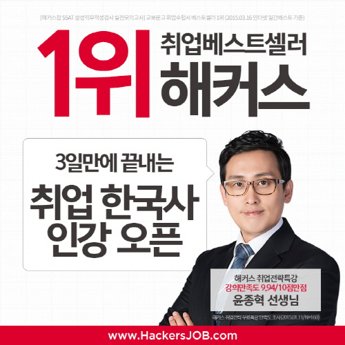 한편 해커스잡은 취업준비생을 위한 자소서 특강부터 인적성ㆍ면접 강의까지 다양한 특강을 꾸준히 진행하고, 취업준비생의 취약점을 파악 후 맞춤 공략법을 제시해 취업준비를 돕는다. '해커스잡 SSAT 삼성직무적성검사 실전모의고사'는 교보문고 취업수험서 베스트셀러 1위(2015.03.06, 인터넷 일간베스트 기준)를 차지했으며, 해커스잡은 온·오프라인 취업강의 누적 수강생 수 57,000명(중복수강생 포함)을 돌파한 이력이 있다.