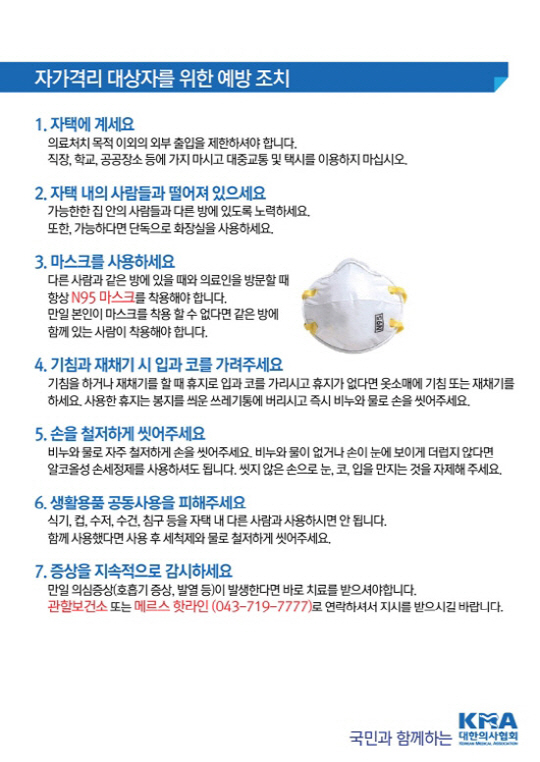 자가격리 대상자를 위한 예방조치로서 △자택에 있기 △자택 내 사람들과 떨어져 있기 △마스크를 사용하기 △손을 철저히 씻기 △생활용품 공동사용을 피하기 △증상 지속적으로 감시하기 등 7가지 행동요령 등이 마련돼 있다.