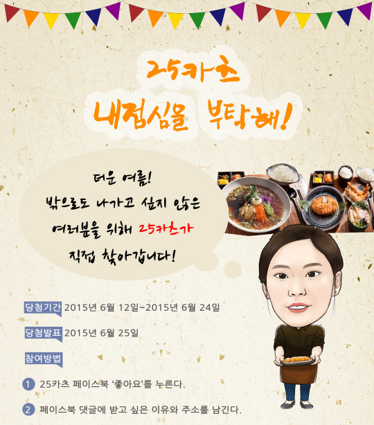 페이스북 계정을 가진 사람이면 누구나 참여할 수 있는 이번 이벤트는 25카츠 공식 페이스북(www.facebook.com/toko25katsu)을 방문해 메인 페이지의 '좋아요'를 누른 후 이벤트 게시글에 사연 댓글을 남기면 자동으로 참가가 완료된다. 추첨을 통해 선정된 당첨자에게 25카츠 쉐프팀이 직접 방문하여 5인 기준의 점심 식사를 제공하며 소정의 기념품이 전달된다. 이벤트 응모기간은 24일까지이며 당첨자는 25일 발표할 예정이다.