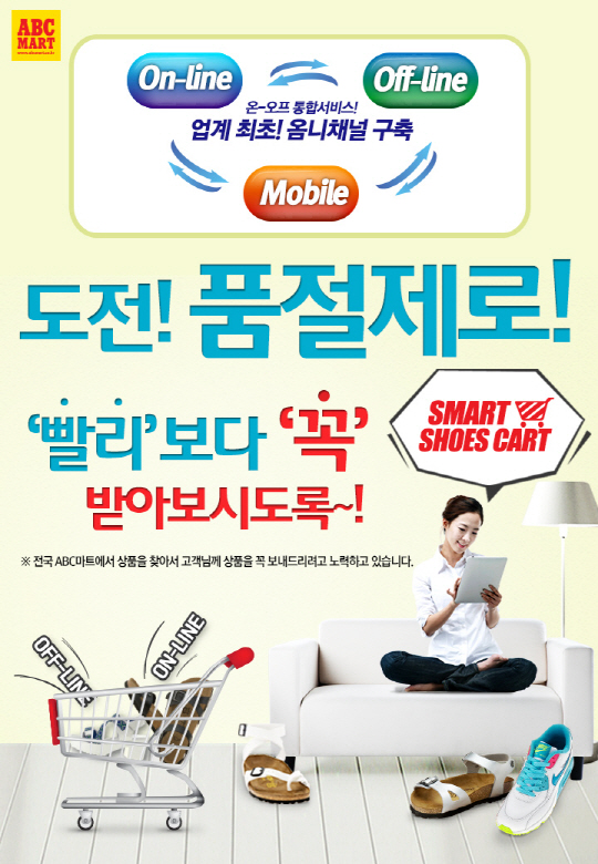 국내 최대 슈즈 멀티스토어 ABC마트(www.abcmart.co.kr, 대표 이기호)가 슈즈 업계 최초로 온-오프라인을 통합하는 옴니채널(Omni Channel) '스마트 슈즈 카트(SMART SHOES CART)'를 구축했다고 지난 12일 밝혔다.