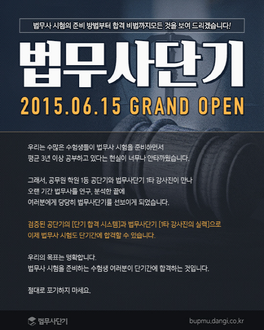 법무사단기 나광웅 본부장은 "법무사 시험을 준비하는 수험생들이 안타깝게도 평균 3년 이상 공부한다는 통계를 보고 공무원 시험준비 전문인 공단기의 검증된 시스템과 법무사 시험 1타 강사진으로 꾸려진 법무사단기를 오픈했다"며 "법무사 시험 단기 합격을 위해 탄탄한 커리큘럼을 구성해 수험생을 위한 다양한 서비스를 진행해 나가겠다"고 말했다.