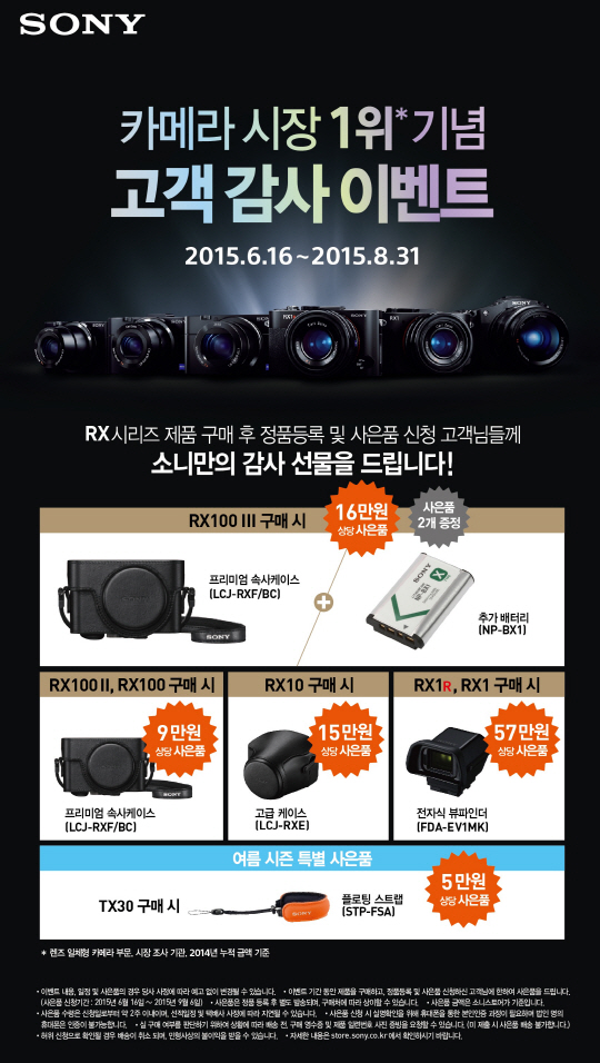 소니코리아(대표 모리모토 오사무)가 16일 국내 렌즈일체형 카메라 시장에서 2015년 금액 기준 누적 점유율 40%를 돌파하며 1위를 기록한 것을 기념해 고객 감사 여름 프로모션을 진행한다고 밝혔다.