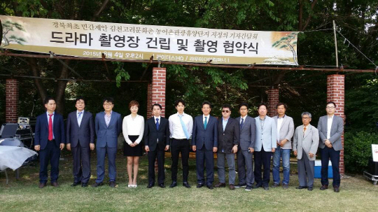 지난 8일 경북 최초 민간제안 '김천고려문화촌 농어촌관광휴양단지' 지정 및 드라마 촬영장 건립식이 김천시 어모면 농어촌관광휴양단지에서 개최됐다. 이날 행사엔 정만복 김천부시장, 김병철 김천시의회장, 전계숙 시의원, 정홍원 (주)라우미디어컴퍼니 대표이사, 이현주 (주)청자이야기 대표이사, 조상복 (주)IHQ 상임고문, 정훈광 ㈜드라마힐즈 대표이사 등이 참석했다.