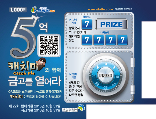 스피또1000 22회차는 16일부터 10월 31일까지 구입할 수 있으며, 당첨금 지급기한은 2016년 10월 31일까지다. 최저 당첨액은 1000원, 최고 당첨액은 5억원이다.