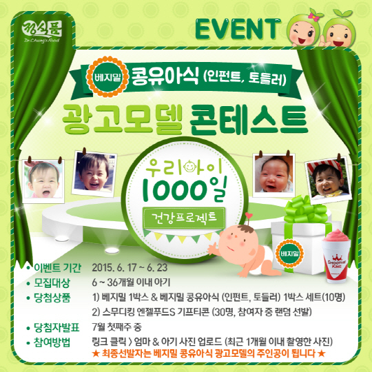 이번 콘테스트는 정식품의 '우리아이 1000일 건강프로젝트'의 일환으로, 베지밀 콩유아식 소비자 모델을 찾고자 마련되었다. '우리아이 1000일 건강프로젝트'는 아기가 태어나 1000일 동안이 아기의 성장과 두뇌발달에 매우 중요한 시기라는 점에 착안해 기획된 정식품의 건강 캠페인으로, 다양한 소비자 참여형 이벤트가 진행된다. 캠페인 기간 동안 모아진 소비자들의 다양한 육아 노하우는 베지밀 콩유아식 TV광고로 방송될 예정이다.