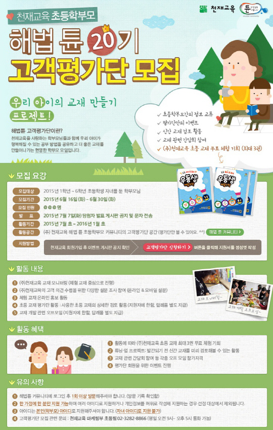 고객평가단은 초등 1~6학년 자녀를 둔 학부모를 대상으로, 30일까지 해법 튠 초등학부모 커뮤니티(http://tune.chunjae.co.kr)를 통해 신청 가능하다. 해법 튠 고객평가단에 선정되면 학부모끼리 자녀의 내·외적 성장을 도울 공부 방법을 공유하고 '내 아이 교재 만들기'에 직접 참여하게 된다. 주요 활동으로는 천재교육 교재 모니터링과 온라인·모바일 설문 조사 참여, 체험 교재 온라인 홍보 활동, 초등 교재 평가 및 교재 개발 관련 모임 참석 등이 있다. 또한 천재교육 초등 교재 무료 체험, 발간 전 신간 교재를 미리 검토해볼 수 있는 '튜닝-업 프로젝트', 교재 관련 간담회 참여 등의 혜택도 주어진다.