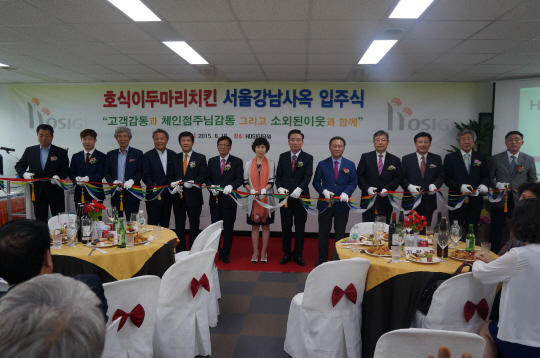 '한 마리 가격에 두 마리 치킨을'이라는 마케팅으로 유명한 호식이두마리치킨이 16일 서울 강남구 논현동 HOSIGI타워에서 서울강남사옥 입주식을 열었다.