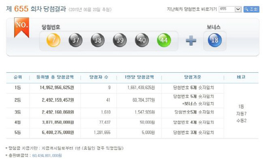 655회 로또당첨번호가 7, 37, 38, 39, 40, 44번으로 결정났다. 2위 당첨여부를 결정하는 보너스 번호는 18번이다.