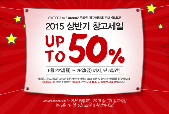 커피 유통 전문 브랜드 어라운지가 26일까지 온라인몰(www.arounz.co.kr)에서 원두와 커피용품 1000여가지 품목을 최대 50% 할인하는 '2015 어라운지 상반기 온라인 창고 세일'을 진행한다.