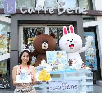 최근 애니메이션 캐릭터만큼 메신저 캐릭터 인기가 대단하다. 커피전문점 카페베네는 네이버의 글로벌 모바일 메신저 '라인(LINE) 프렌즈'와 손잡고, '카페베네 눈꽃빙수 8종'을 출시해 이색 프로모션을 진행 중이다. 카페베네가 7주년을 맞아 선보인 '눈꽃빙수 8종'은 부드러운 우유 얼음, 다채로운 토핑과 함께 브라운, 코니 등 '라인'의 인기 캐릭터를 활용한 초코판이 제공된다. 눈꽃빙수를 주문할 시 '라인프렌즈'의 코니 및 브라운 인형 시즌3를 9000원에, 당근 코니 인형과 하트 브라운 인형을 1만8000원에 구입할 수 있는 프로모션을 8월 31일까지 진행한다.