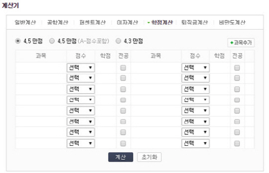 학점계산기는 과목별 점수와 학점을 입력하기만 하면 곧바로 평균 평점을 계산해준다. '4.3점 만점'과 '4.5점 만점' 두 가지 타입 중 하나를 선택, 과목별 점수를 입력하면 된다. <스포츠조선닷컴>
