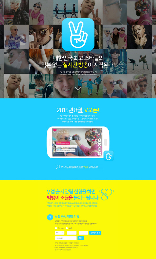 1일 네이버에 따르면 브이는 기존 서비스와는 차별화되는 '셀러브리티의 개인 방송 생중계'를 콘셉트로 하는 별도의 모바일 애플리케이션 서비스다. 글로벌 이용자를 주 타깃으로 하는 만큼 한글이 아닌 영어 버전으로 출시될 예정이다. 해당 서비스를 통해, 이용자는 평소에는 쉽게 접하기 어려운 스타들의 일상 및 다양한 모습을 생생한 영상으로 확인할 수 있다. 브이는 빅뱅, 2PM 등 한류를 이끄는 여러 셀럽들이 함께 한다. 빅뱅은 이미 지난달 1일, 네이버 스타캐스트 생중계를 통해 개인 방송에 대한 계획을 발표하고 팬들의 다양한 의견을 수렴한 바 있으며 지난 30일 저녁, 신곡 공개를 앞두고 'D라이브'를 진행하며 '브이' 관련 소개 및 관련 영상을 공개했다.