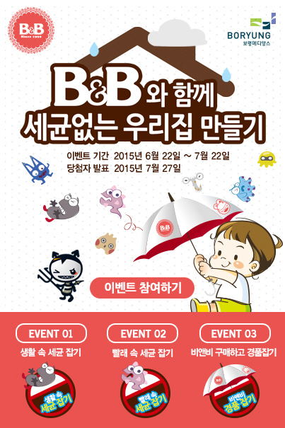 '생활 속 세균잡기', '빨래 속 세균잡기' 이벤트의 진행기간은 7월 22일까지, 'B&B 구매하고 경품잡기' 이벤트의 진행기간은 7월 13일까지 진행된다. 자세한 내용은 B&B 브랜드사이트(bnb.medience.co.kr) 에서 확인할 수 있다.