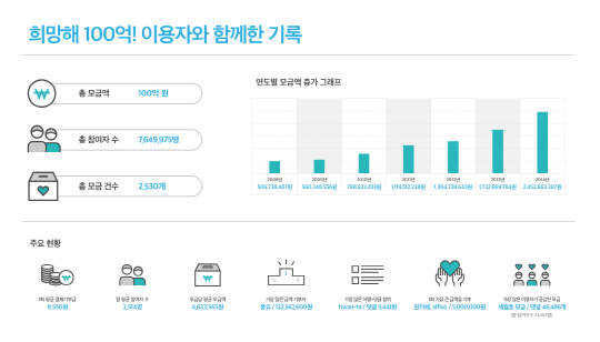 모금액은 연도별로 증가세다. 서비스 첫해인 2008년 약 5억원의 모금을 달성했고, 2010년 7억8000만원, 2011년 11억원, 2012년 13억원, 2013년 17억원, 2014년 24억원 등 연평균 약 30%의 증가세를 보였다.