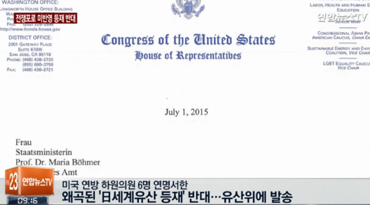 마이크 혼다, 크리스 깁슨, 찰스 랭글 등 미국 연방 하원의원 6명은 마리아 뵈머 유네스코 세계유산위원회 의장에게 친필 서한을 보내 "왜곡된 일본 산업혁명시설의 세계유산 등재에 반대한다"라고 주장했다.