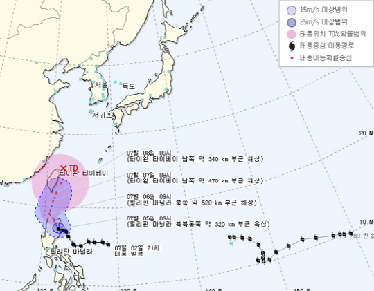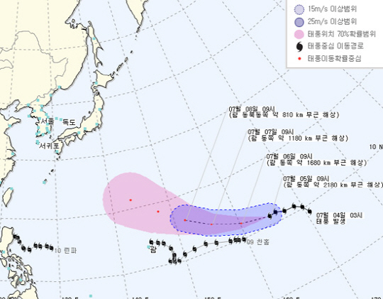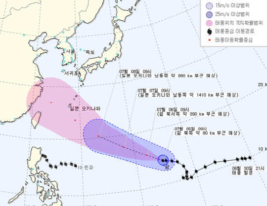 7일에는 일본 오키나와 동남동쪽 약 1470km 부근 해상으로 올라와 중심기압 945 헥토파스칼(hPa), 중심 부근 최대풍속 45m/s의 매우 강한 중형 태풍으로 발달할 것으로 예보됐다.