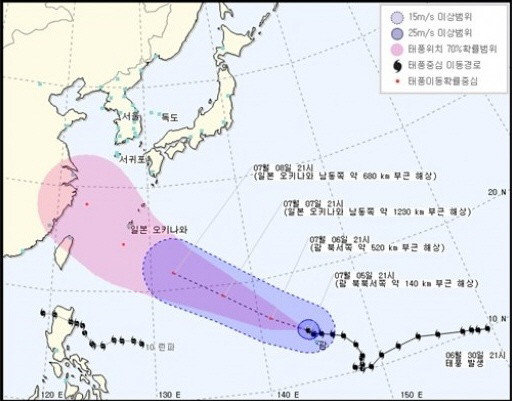 태풍 '찬홈'과 제10호 태풍 '린파'의 진로가 유동적이어서 강수구역과 예상강수량의 변동 가능성이 있으니 앞으로 발표되는 기상정보를 참고해야 한다고 당부했다. <스포츠조선닷컴>