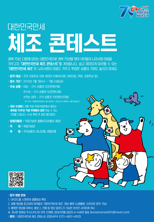 하나은행(은행장 김병호)과 외환은행(은행장 김한조)은 대한민국 광복 70년을 맞아 국가보훈처(처장 박승춘) 및 독립기념관(관장 윤주경)과 함께 어린이들이 나라사랑의 마음을 키울 수 있도록 전국 유치원, 어린이집, 초등학교 등 어린이를 대상으로 『대한민국만세 체조 콘테스트』를 24일까지 진행한다고 밝혔다.