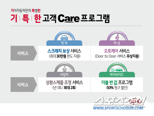 여성 케어 서비스는 출고 후 1년간 ▲전화 한 통화로 집까지 차량을 찾아오고 가져다주는 '도어 투 도어 서비스' 2회(오토큐 이용 고객 限) ▲26개 항목의 정기점검 서비스 1회 및 실내항균탈취제, 인테리어 코팅제, 컴파운드, 극세사 타월 등으로 구성된 케어 키트 제공(기아레드멤버스 가입 고객 限, 출고 후 3개월 이후부터 가능) 등의 혜택을 담은 프로그램이다.