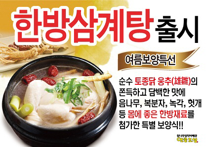 닭고기는 단백질의 함유량이 높고 지방이 적어 소화에 좋고 뜨거운 음식을 통해 신체의 온도와 바깥의 온도를 맞출 수 있기에 보양식으로 제격이다. 이에 참나무장작 바비큐전문점 옛골토성이 한방삼계탕을 출시해 높은 호응을 얻고 있다.