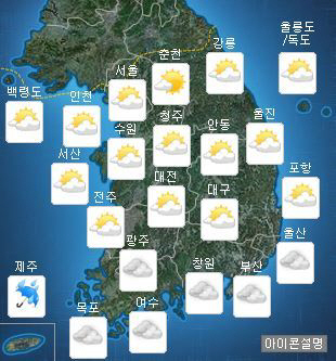 아침 예상 최저기온은 ▲서울 24도 ▲대전 23도 ▲부산 22도 ▲대구 21도 ▲광주 23도로 평년과 비슷하겠다. 최고기온은 ▲서울 35도 ▲대전 32도 ▲부산 27도 ▲대구 29도 ▲광주 30도로 평년보다 높겠다.