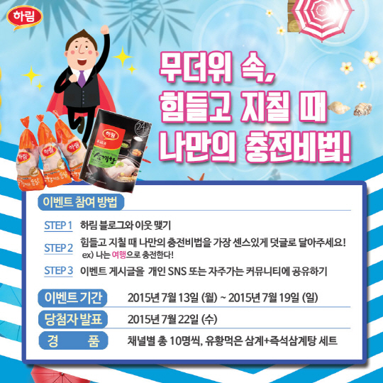 ㈜하림은 삼복 시즌을 앞두고 '나만의 충전비법 이벤트'를 7월 13일(월)부터 19일(일)까지 일주일간 진행한다. 이번 이벤트는 더운 날씨로 인해 약해진 기력을 충전하는 노하우를 서로 재미있고 유익하게 공유하고자 마련된 이벤트로서 하림의 공식SNS 채널인 블로그(blog.naver.com/harimmarket), 페이스북(www.facebook.com/harimslim), 카카오스토리(story.kakao.com/ch/harimtalk)를 통해서 진행한다.