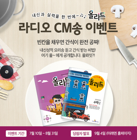 교육출판전문기업 ㈜미래엔(대표 김영진)의 중고등 내신 대비 학습서 '올리드'가 라디오 광고 온에어를 기념해 '라디오 CM송 이벤트'를 진행한다.