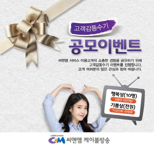 씨앤앰케이블방송(cable & more, 대표 장영보)이 고객만족 활동을 강화하기 위해 자사 서비스 이용자를 대상으로 고객 감동 수기를 공모한다.