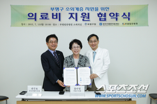 한마음재단은 13일, 인천광역시 부평구 부평동에 위치한 힘찬병원에서 한국지엠 대외정책본부 한주호 부사장을 비롯, 홍미영 부평구청장과 이수찬 상원의료재단 이사장 및 관계자들이 참석한 가운데 저소득가정 관절 환자의 무료수술 지원을 위한 상호협약식을 갖고 첫 수혜자인 김혜성씨(56·인천 부평구)에게 좌측 무릎 인공관절수술비 일체를 지원했다.