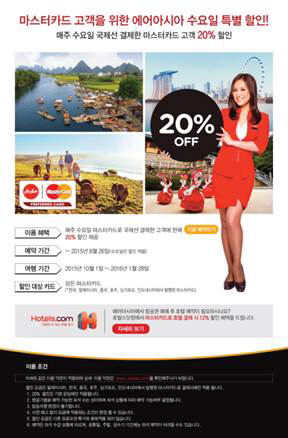 8월 26일까지 매주 수요일에는 마스터카드로 에어아시아에서 국제선을 결제한 고객에게 20% 할인 혜택을 제공하고 있다. 예약 가능한 여행 기간은 2015년 10월 1일부터 2016년 1월 28일까지이며, 한국과 말레이시아, 중국, 호주, 싱가포르, 인도네시아에서 발급한 마스터카드로 해당 국가에서 출발하는 국제선을 결제할 경우 적용된다.