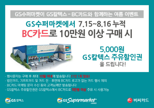 GS칼텍스 역시 같은 기간 BC카드로 10만원 이상(누적) 결제 시 GS수퍼마켓 5천원 할인 쿠폰을 선물한다.