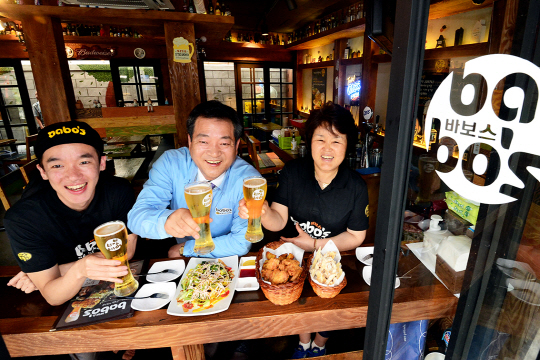 창업시장에 새로운 변화를 이끌고 있는 조동민 프랜차이즈산업협회장(가운데)이 운영하는 미들비어 브랜드인 바보스를 통해 업종변경에 성공한 양선희 점주(오른쪽). 바보스의 상생노력은 단순 창업지원을 넘어 매장 활성화 등 범위가 다양한 게 특징이다.