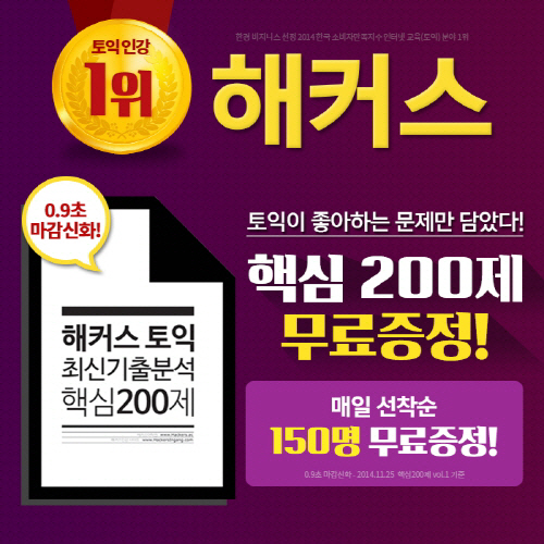 이런 가운데, 해커스는토익인강 1위 선정에 대한 감사의 마음으로 '해커스토익 최신기출분석 핵심 200제' 무료 증정 이벤트를 실시한다.