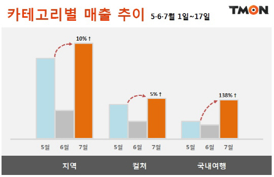 그러나 감소추세를 보였던 지역과 문화공연 매출이 7월 들어 다시금 소비자들이 찾으며 메르스 발생 이전인 5월과 비교해, 지역상품 매출은 10%가량 증가했으며, 문화공연상품 또한 5%가량 상승했다. 아울러 내수시장을 살리기 위한 정부와 지자체의 노력으로 국내여행지에 대한 관심도 높아지고 있다. 국내여행은 5월보다 매출이 138% 증가했으며 6월 급감했던 워터파크 매출도 5월대비 215% 상승했다. 티몬은 외도와 통영 소매물도 1박2일 상품을 14만4000원부터 선보이고 있으며, 한국의 나폴리라 불리는 강원도 삼척의 장호항 스노클링 패키지를 1만7500원부터 판매하고 있다. 당일 전주 한옥마을과 죽농원 여행 상품을 2만8500원, 보령 머드축제 상품을 1만4500원, 하루 300명만 탐방할 수 있는 곰배령 당일 트래킹 상품을 4만원부터 판매하고 있다. 7월 말까지 구매금액에 따라 최대 5만원을 할인 받을 수 있는 '썸머브레이크'기획전을 진행해 소비자들의 알찬 여행을 돕는다.