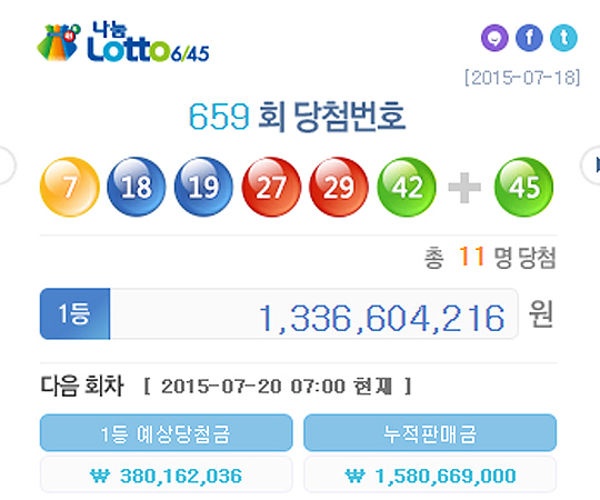 지난 7월 18일 나눔로또에 따르면 로또 659회 1등 당첨번호는 7, 18, 19, 27, 29, 42이며, 보너스 번호는 45번으로 결정됐다.