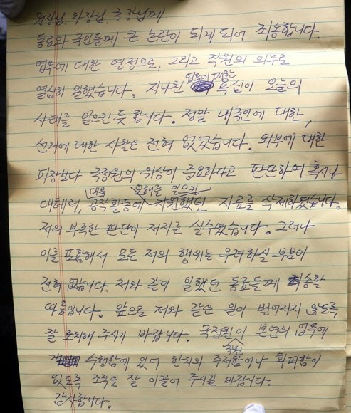 저의 부족한 판단이 저지른 실수였습니다. 그러나 이를 포함해서 모든 저의 행위는 우려하실 부분이 전혀 없습니다. 저와 같이 일했던 동료들께 죄송할 따름입니다. 앞으로 저와 같은 일이 벌어지지 않도록 잘 조치해 주시기 바랍니다. 국정원이 직원이 본연의 업무에 수행함에 있어 한치의 주저함이나 회피함이 없도록 조직을 잘 이끌어 주시길 바랍니다.