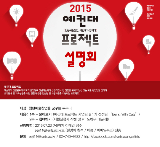한편, 예컨대 프로젝트 사업설명회' 참여신청 및 자세한 문의는 한국예술종합학교 청년예술가 지원센터에서 가능하다.(eeji11@karts.ac.kr / 02-746-9822 / www.facebook.com/kartssyoungartists)