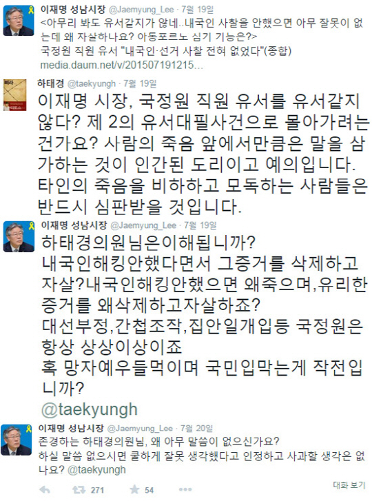 사망한 국정원 직원 유서 공개에 이재명 성남시장과 새누리당 하태경 의원이 SNS 설전을 벌였다.