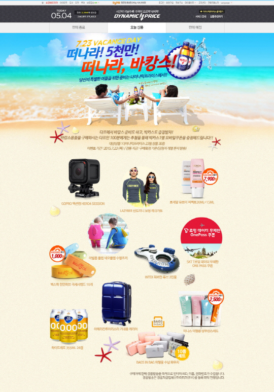 여름 휴가철을 앞두고 인터파크(www.interpark.com)의 고객참여형 가격결정쇼핑 '다이나믹프라이스(Dynamic Price)'가 23일 '떠나라, 5천만! 떠나라, 바캉스' 기획전을 진행한다.