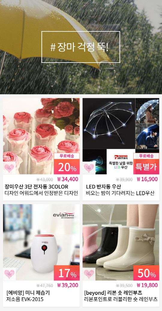 보송보송한 여름을 위한 착한 제습제를 690원, 초소형 미니 제습기를 3만원대에 판매한다. 비오는 날에도 스타일리쉬한 여성을 위해 산뜻한 색상과 세련된 디자인이 돋보이는 레인코트, 레인부츠, 비오는 날 더욱 빛나는 LED 반자동 우산 등 멋과 기능을 살린 15가지 카테고리 상품을 최대 반값으로 할인한다.