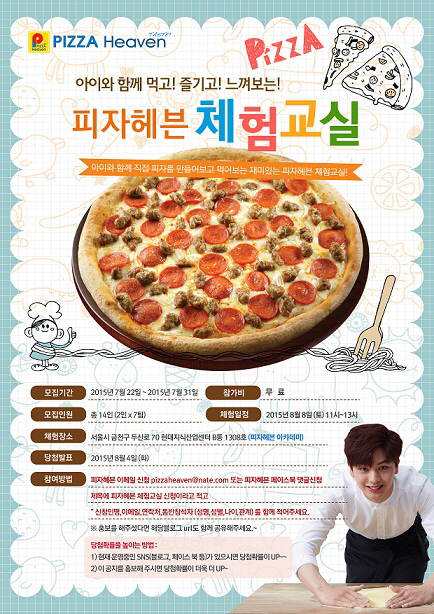 피자헤븐 관계자는 "체험교실은 부모와 자녀가 함께 피자를 만들고 맛볼 수 있는 자리여서 가족끼리 즐길 수 있는 좋은 시간인 될 것"이라며 "참가자 전원에게는 게임을 통해 시식권 및 아이들이 좋아하는 소정의 상품 등을 증정할 계획"이라고 말했다.