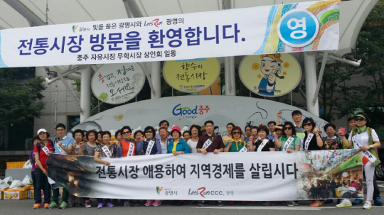 한국마사회 렛츠런문화공감센터(렛츠런CCC) 광명이 광명시에서 추천받은 지역 내 저소득 100가구에 10만원 상당의 온누리상품권(전통시장상품권)을 기부하고, 21일 지자체 관계자 및 렛츠런 문화공감센터 광명 직원과 문화강좌 회원 등 총 50여명이 함께 충주에 있는 자유시장과 무학시장에서 장(場)을 보는 뜻깊은 시간을 가졌다. 이번 행사는 메르스로 인해 침체된 지역경제 활성화를 위해 마사회가 추진 중인 '장마(場馬)운동'의 일환으로 지역의 저소득 가정을 도우면서 지역경제살리기에 적극 동참하기 위해 진행됐다. 렛츠런CCC 광명과 광명시는 '전통시장 애용으로 지역경제를 살립시다' 및 '지역경제 활성화' 메시지가 담긴 현수막과 어깨띠를 부착하고 지역경제 활성화 캠페인을 전개했다. 박진우 렛츠런CCC 광명지사장은 "향후에도 지역의 소외계층 지원 등 나눔문화 실천 및 사회공헌활동을 지속적으로 전개해 지역 주민과 소통하고 상생협력해 나가겠다"고 밝혔다.